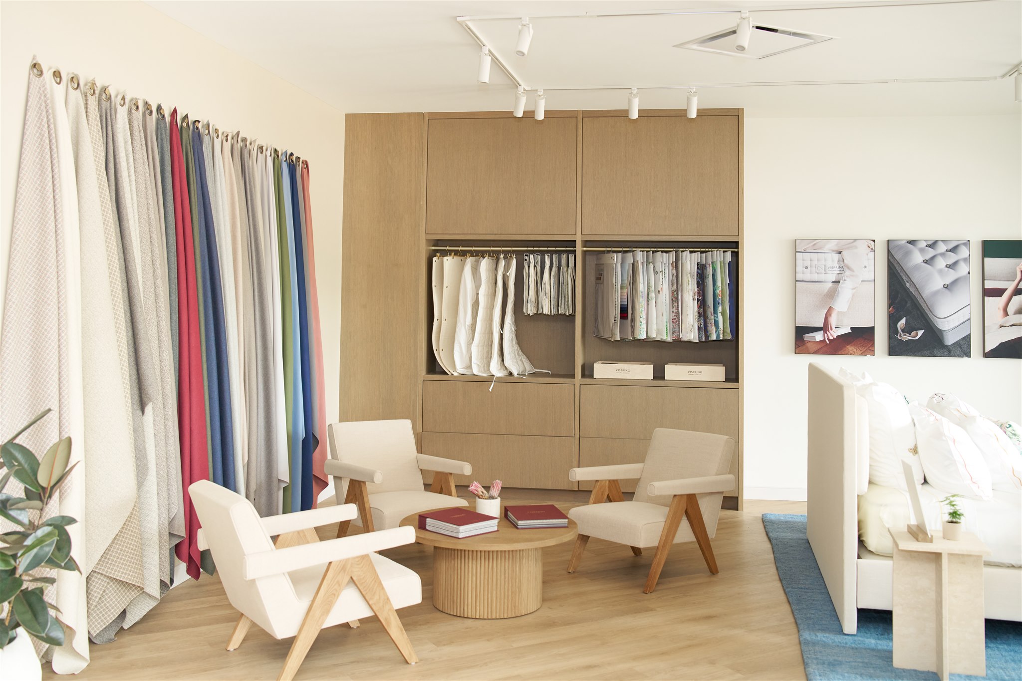 The new showroom features the new Vispring Wool Fabrics collection, showcasing our innovative approach to sustainable luxury through elegantly hanging fabric displays, featuring 25 new textiles that showcase premium wools in a sophisticated spectrum of natural and warm hues. From the silken touch of immaculate Satin to the irresistible texture of plush Wool Bouclé, this curated collection offers discerning clients a range including refined plain finishes to subtle patterns, distinguished Tweeds, and timeless Herringbone designs.